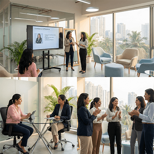 This workshop focuses on building confidence, executive presence, and authentic communication. Through activities such as voice modulation exercises, body language awareness, and role-play scenarios, participants practice speaking up in meetings, handling interruptions, and presenting ideas with clarity. For example, women may rehearse responding to being spoken over or confidently sharing viewpoints in leadership forums.