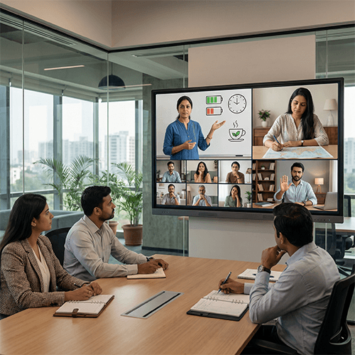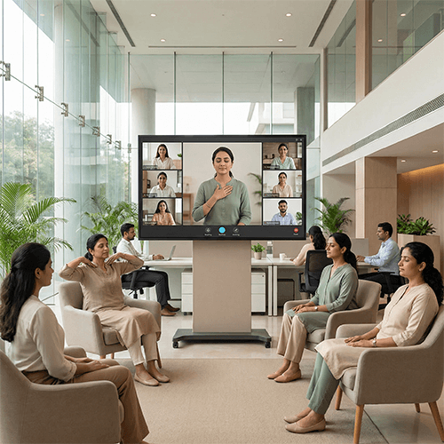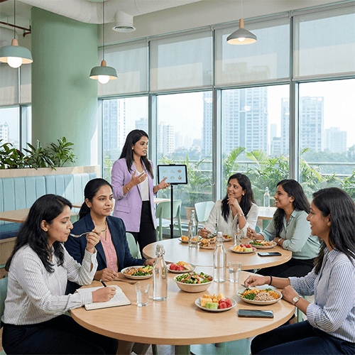 This is an expert-led virtual wellness experience designed to help women manage stress, energy, and emotional load at work. Session includes guided breathing for anxiety, desk-friendly stretches, mindfulness practices for focus, and short reflective journaling exercises. For example, releasing mental fatigue before performance reviews or building calm confidence before high-stakes meetings. These sessions help normalise conversations around mental and emotional wellbeing.